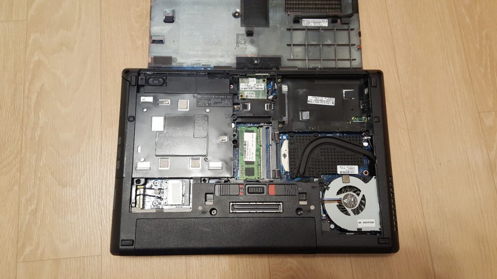 업그레이드를 위해 쉽게 하판을 제거할 수 있습니다. 슬라이딩 방식이며, 우측상단이 HDD, 중앙이 메모리 교체 슬롯입니다.