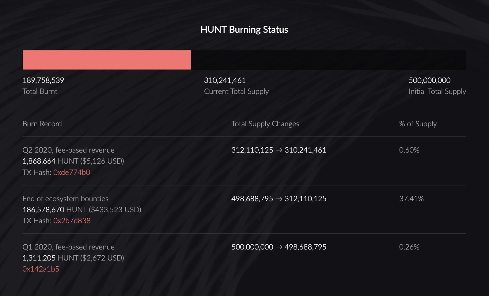 이제 헌트 토큰의 총 공급량은 310,241,461 HUNT가 되었고, 이는 초기 발행량의 62% 수준으로 줄어들어 있습니다. 헌트 토큰 소각 모델의 목표는 이와 같이 플랫폼의 댑에서 발생하는 수입을 꾸준히 토큰 소각으로 연결시켜서 토큰 가치를 증대시키는데 있습니다.
