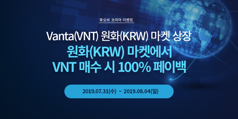 안녕하세요. 6년 보안 무사고 글로벌 최대 암호화폐 거래소 “후오비 코리아”입니다. 2019년 7월 31일(수), Vanta(VNT)가 후오비 코리아 원화(KRW) 마켓에 상장됩니다. 또한, 원화(KRW) 마켓 상장 기념 “원화(KRW) 마켓에서 VNT 매수 시, 100% 페이백” 이벤트가 진행됩니다. ☞ VNT/KRW 매수하러 가기 ■ ...