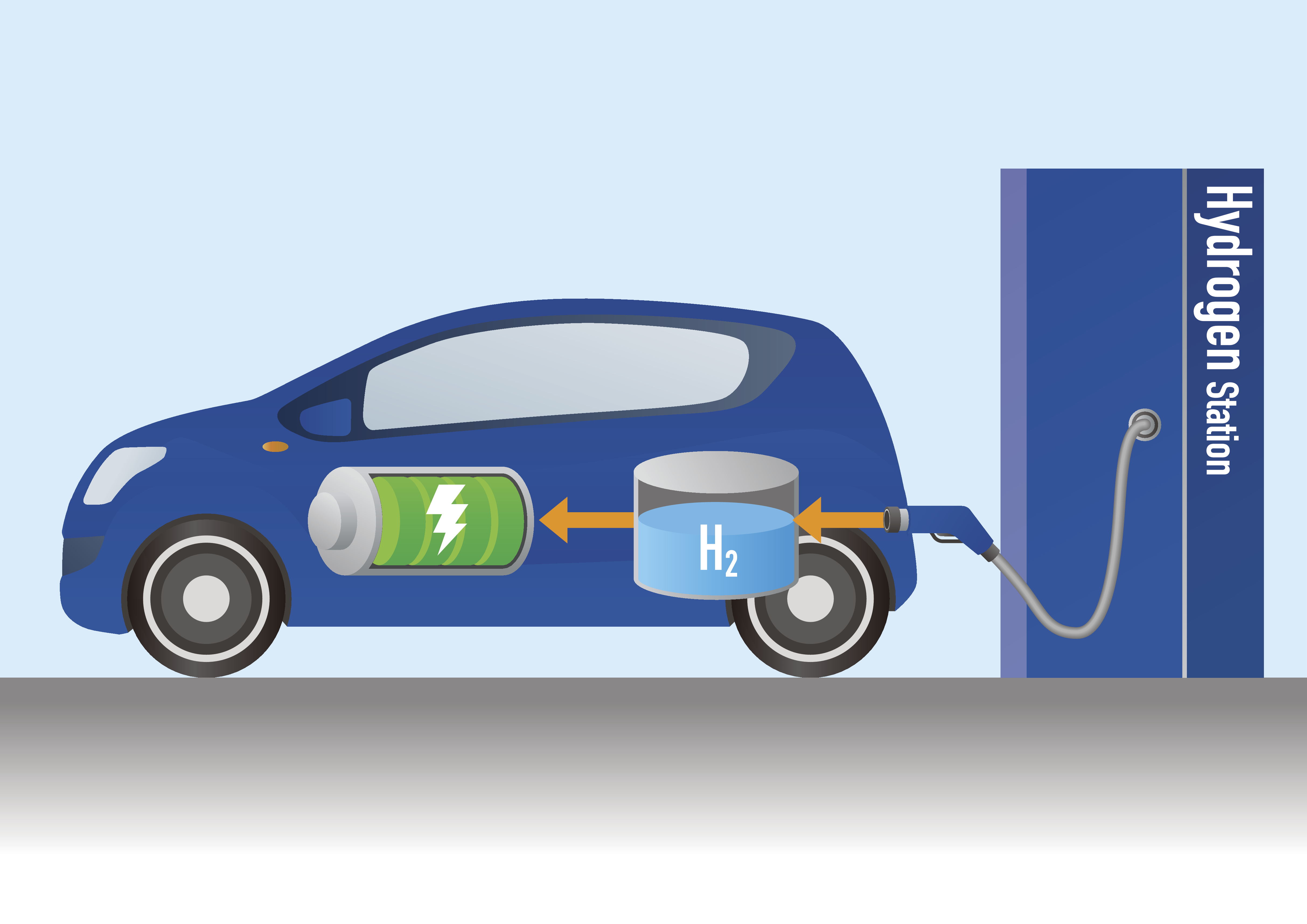수소차의 기본 원리는 수소와 산소가 결합할 때 생기는 화학에너지를 전기에너지로 변환하는 것부터 시작합니다. 수소전기차 내부에 있는 연료전지 양 극에서 수소와 산소를 받아들이면 물이 생기게 되는데, 이때 두 전극 사이에서 0.7볼트의 전압이 발생합니다. 이를 여러 개의 직렬로 연결하여 원하는 전압을 얻고, 이를 통해 수소전기차는 움직입니다.