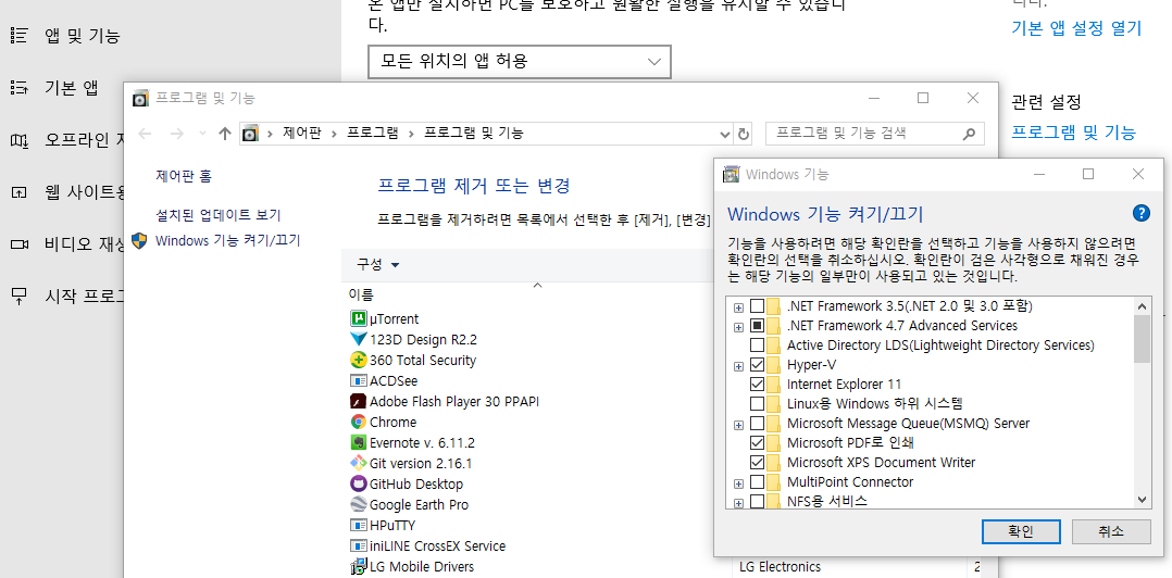 의미전달로 찾기가 좀 난해한데.. "프로그램 및 기능" -> "Windows 기능 켜기/끄기" 에서 Hyper-V 를 발견할 수 있다.