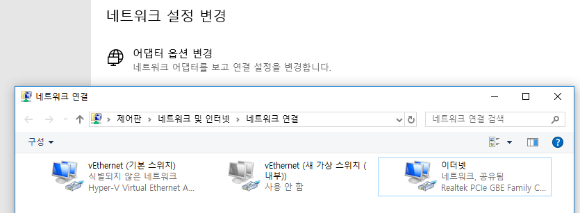 이미지와 같이 가상스위치 관리자에서 추가된 내용이 네트워크 어댑터에 보여진다. 그런데 가상 스위치 관리자에서 추가했음에도 어떠한 원인인지 모르게 "Hyper-V Virtual Ethernet Adapter" 라고 명명되지 않은 경우가 보이곤 했다. 이것하고 원래의 이더넷과 연결해봐야, 게스트 컴퓨터에서 연결되어지지 않았다.