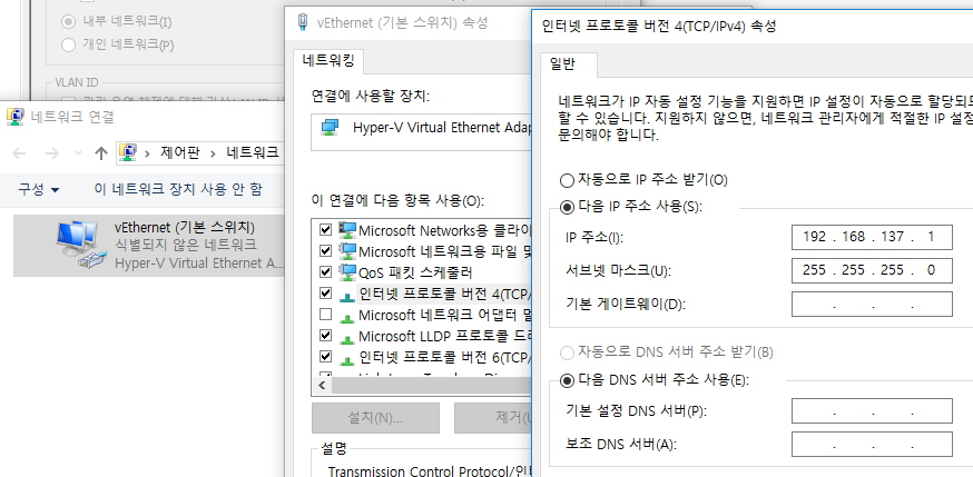 - 호스트 컴퓨터에서 가상 스위치 설정 (Hyper-V Virtual Adapter 로 인식될것)