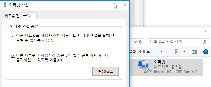 - 호스트컴퓨터에서 이더넷 공유설정