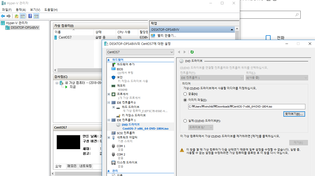Hyper-V 가 설치되고 나면, Hyper-V 관리자로서 새로운 가상 컴퓨터를 만들고, ISO 파일을 연결해서, 설치하게 할 수 있다. ISO 파일을 연결하는 것은 "DVD 드라이브" 에서 "이미지파일" 에 연결하는 것으로 설치 작업을 진행하게 할 수 있다.
