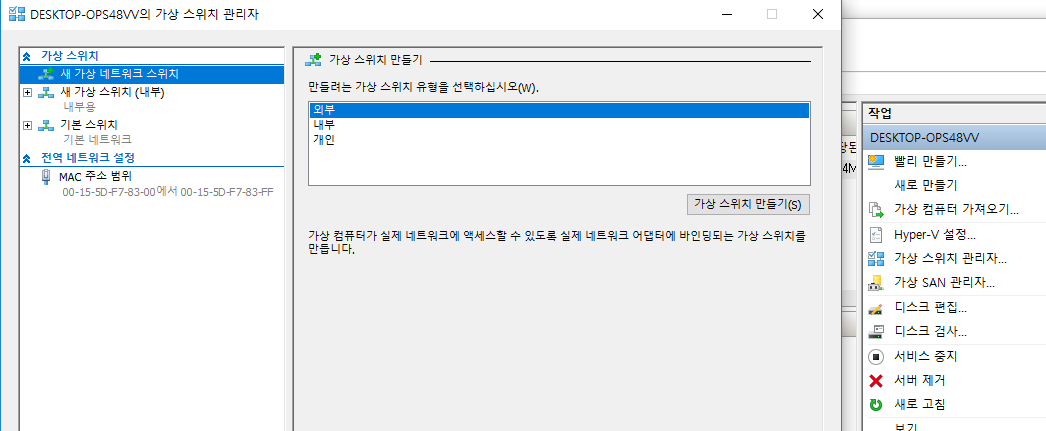 일단 Hyper-V 관리자에서 "가상 스위치 관리자" 라는 것이 있다.