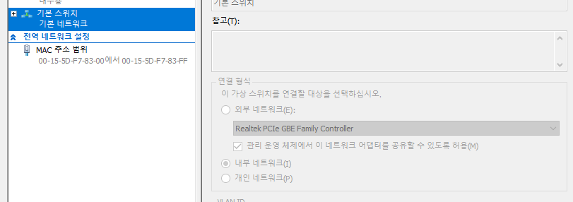일단 가상 스위치 관리자에서 사용하고자 하는 가상스위치의 연결속성을 "내부" 로 설정한다.