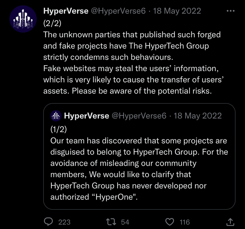 In our Twitter Page, shortly after we discovered the exploit, it is quite easy to see when the shift happened from HyperVerse related content to HyperNation related content in May 2022.