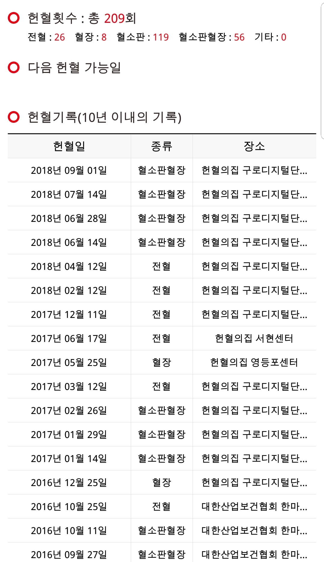 정기적으로 헌혈을 해오다가 오늘 드디어 209회 헌혈을 했네요!