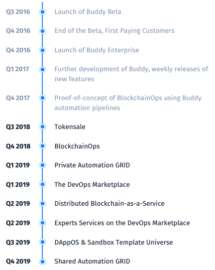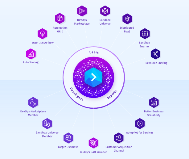 Dengan cara yang sama bahwa Buddy telah berhasil memperkenalkan otomatisasi pengembangan ke pengembang web, Buddy juga memelopori otomatisasi pengembangan proyek-proyek berbasis Blockchain. Pengembang Blockchain dapat menggunakan layanan ini untuk merancang pipa-pipa otomatisasi dengan tindakan siap-pakai: mulai dari menyusun dan menguji, hingga penyebaran, skrip khusus, dan pemantauan dApps. Proses ini sangat mudah dan menyerupai membangun rumah dari batu bata: Anda memilih elemen yang Anda butuhkan dan meletakkannya di tempat yang diinginkan, menyesuaikan konfigurasi seperlunya.