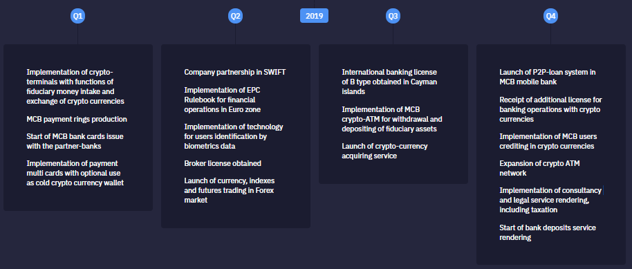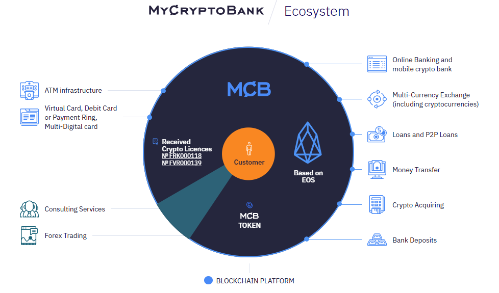 MyCryptoBank is intended to solve this problem. This will be the first bank for cryptocommunity, which allows clients to receive and send funds in cryptocurrencies and fiat money and also exchange between cryptocurrencies and fiat money in banks. With MyCryptoBank it will be possible to make deposits, receive loans and credit. The bank will create an infrastructure that will allow obtaining arrangements and traders for payment of goods for companies and online services. Clients will be able to accept bank cards and with that assistance they will collect funds available through any ATM in the world and also pay at shops, restaurants etc.