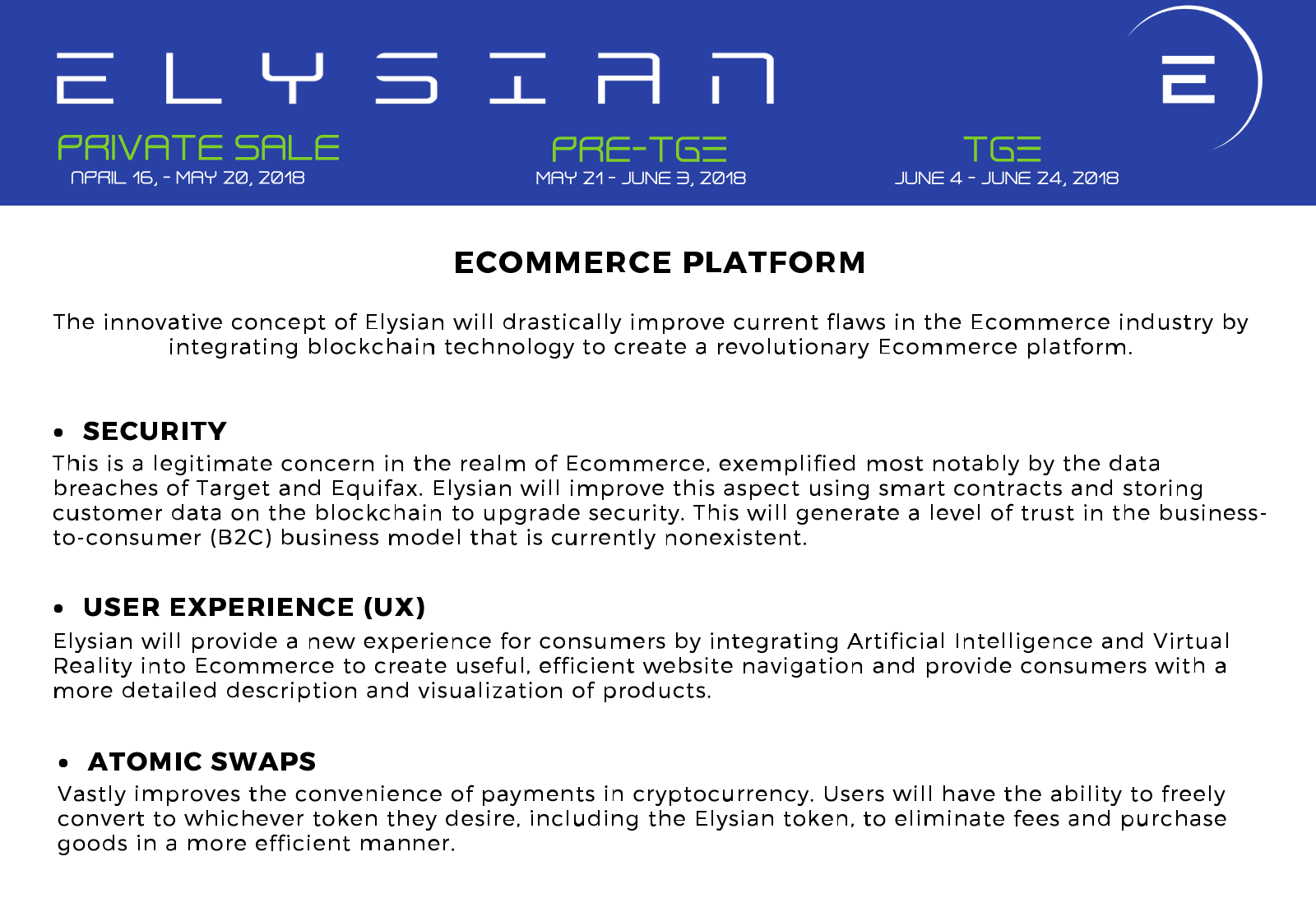The primary function of the Elysian platform is to revolutionize the entire Ecommerce industry by improving security and creating a new, unique user experience. Elysian will be the first Ecommerce platform to combine two vital aspects that are necessary for the progression of the industry - integrating blockchain to store all customer data securely and using technological advancements such as Artificial Intelligence and Virtual Reality to help differentiate Elysian from competition in terms of user experience. Clients will have the ability to use the Elysian platform for their own businesses, providing an upgraded level of functionality. The platform will act as a foundation for other future Ecommerce businesses that will enter the space. Essentially it will act as an intermediary between our clients and their target consumer demographic. Elysian will also give third-party agencies the ability to build on top of the Elysian platform to host their current clients’ platforms on our platform. This will ultimately strengthen the Elysian ecosystem and provide immediate access to client bases of other Ecommerce platforms, giving them an incentive to switch to the