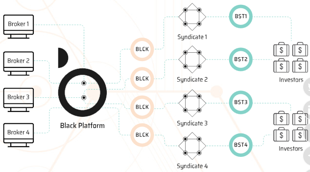 => Black Syndicate Tokens (BST) (выдается при настройке платформы). BST - это инвестиции в страховой капитал, а для каждого синдиката (маркер безопасности) создается специальный BST, портфель страхования производительности для конкретного синдиката будет принадлежать его владельцам BST.