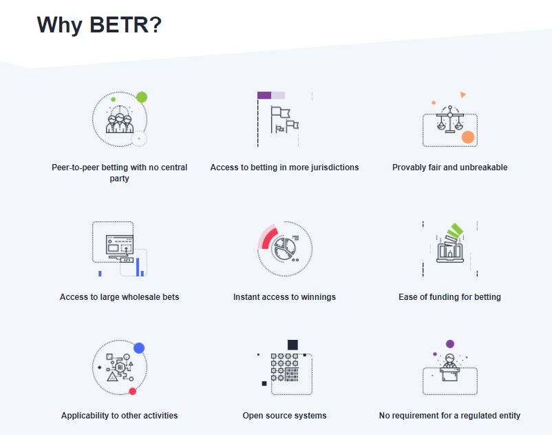 BETR è diverso. Questa è una scommessa cripto-valuta che costruirà quello sport scommesse davvero decentrate su internet. Con BETR che fornisce sicurezza, le scommesse peer-to-peer di true finance diventano possibili su Internet con entità che non hanno una relazione precedente. Usando blockchain possiamo fornire ai clienti delle scommesse sportive che operano senza un corpo umano o aziendale nel mezzo. Il sistema è sicuro, il software e le transazioni sono dimostrabili e potenti. Aggiunto sulla facilità di pagamento delle scommesse sulla valuta BETR e sul fatto che è possibile fare grandi scommesse, e si può capire perché scommettere su BETR è il futuro delle scommesse.