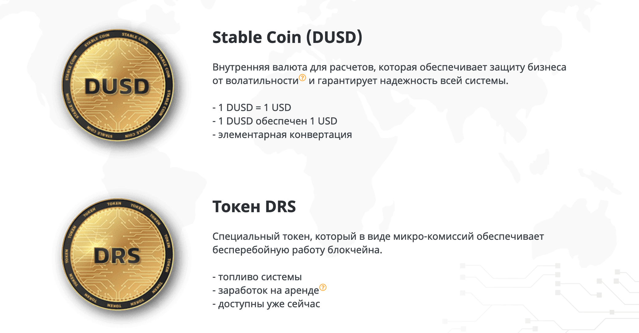 На платформе DARS будет применяться 2 токена: DUSD это стэйбл коин, равный 1 USD, для проведения расчетов между дистрибьюторами, поставщиками и клиентами и токен DRS, который будет чем то вроде топлива (газа) платформы, необходимого для проведения любых операций. Что интересно, токены DRS можно будет сдавать в аренду, получая дополнительный пассивный доход.