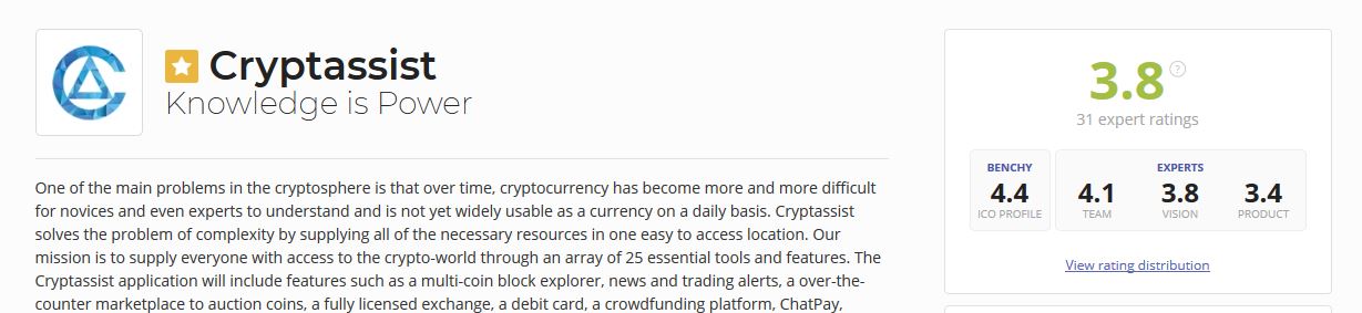 Before investors put their money into a project they just must listen to what experts in the field have to say about the project. I would do justice to this section based on ICOBENCH rating mechanism. Thirty-one Blockchain/Business experts have giving cryptassist a percentage score of 76% which is equivalent to 3.8/5 in ICOBench rating standard. This shows the project tends to solve an underlying problem in the crypto space, and this rating is based on the Team capability, experience, and expertise which scored 4.1/5. The vision and the product all added up to this rating.