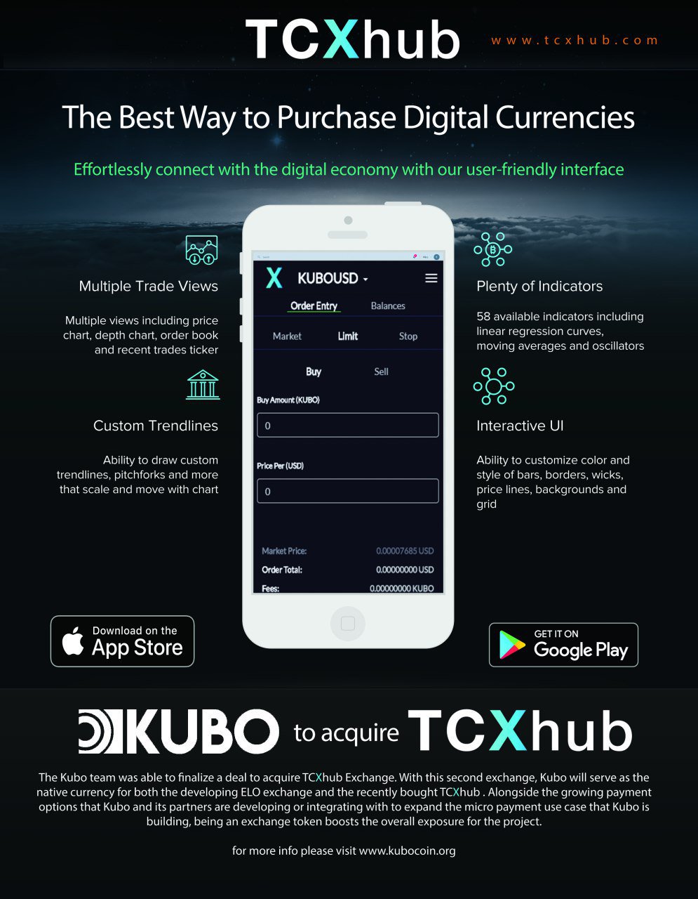 To maximize the reach and effect of this ecosystem, the KuboCoin project partnered with the block chain solution company Aeryus that will be providing Kubo the software and hardware to on ramp merchants across all physical locations and online commerce while providing an easy to set up and run point of sale system similar to Square. Kubo will also boast the added bonus of digital mobile wallets that substituted not only as typical debit cards but as a payment pathway for Kubo investors through the Aeryus One App and Kubo’s mobile exchange App (TCX Hub Mobile).