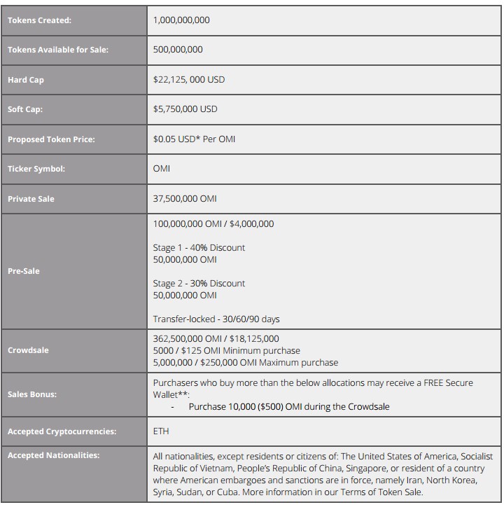 The ECOMI token called OMI is an utility token that will be used for all transactions in the ecosystem. Crowdsale starts on 30th June, 2018 (00:00 NZDT) and end on 30th September, 2018 or upon sale of 500,000,000 OMI tokens or upon reaching the hard cap ($22,125,000), whichever comes earlier.