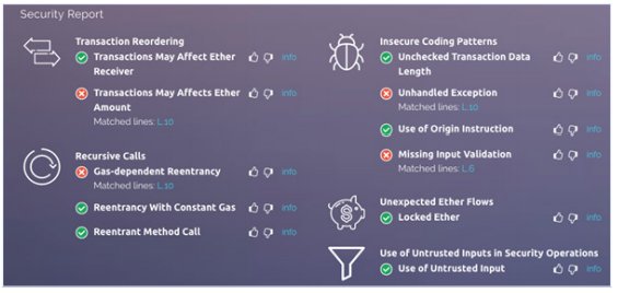 Jüngste Untersuchungen zeigen, dass fast die Hälfte aller bestehenden Smart-Verträge von Ethereum als gefährdet eingestuft wurden (8.833 der 19.336) 1. Wie die Parity Wallet-Bibliothek incident2 zeigt, sind auch die erfahrensten Entwickler anfällig für Fehler. Die Automatisierung von Tests und die problemlose Integration in jeden dApps-Entwicklungsworkflow würde die Qualität und Sicherheit von Smart Contracts drastisch erhöhen. Securify ist ein kostenloser Service von Software Reliability Lab. Es ermöglicht die automatische Analyse eines Ethereum-Vertrags auf kritische Sicherheitslücken und unsichere Programmierung über eine Website. Hier ist ein Beispiel: