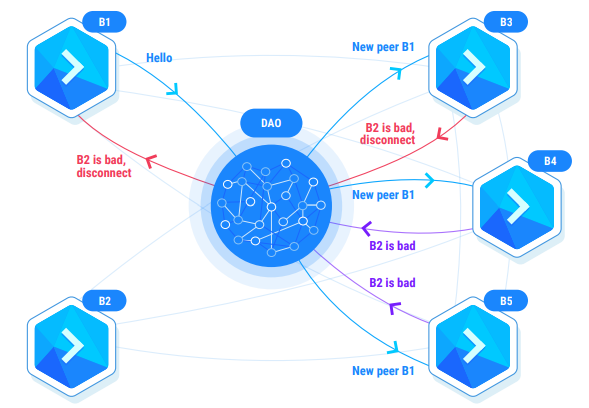 Buddy verwendet ein eigenes P2P-Netzwerk, dessen Peers von Buddy's DAO moderiert werden. Neue Peers melden ihre Adresse an die Organisation, die später verwendet wird, um Listen von Peers von anderen Knoten abzurufen. Außerdem können Knoten Buddy melden, dass ein Peer defekt oder unehrlich ist. Dies kann auf technische Probleme (z. B. keine Verbindung) oder auf Missbrauch zurückzuführen sein.