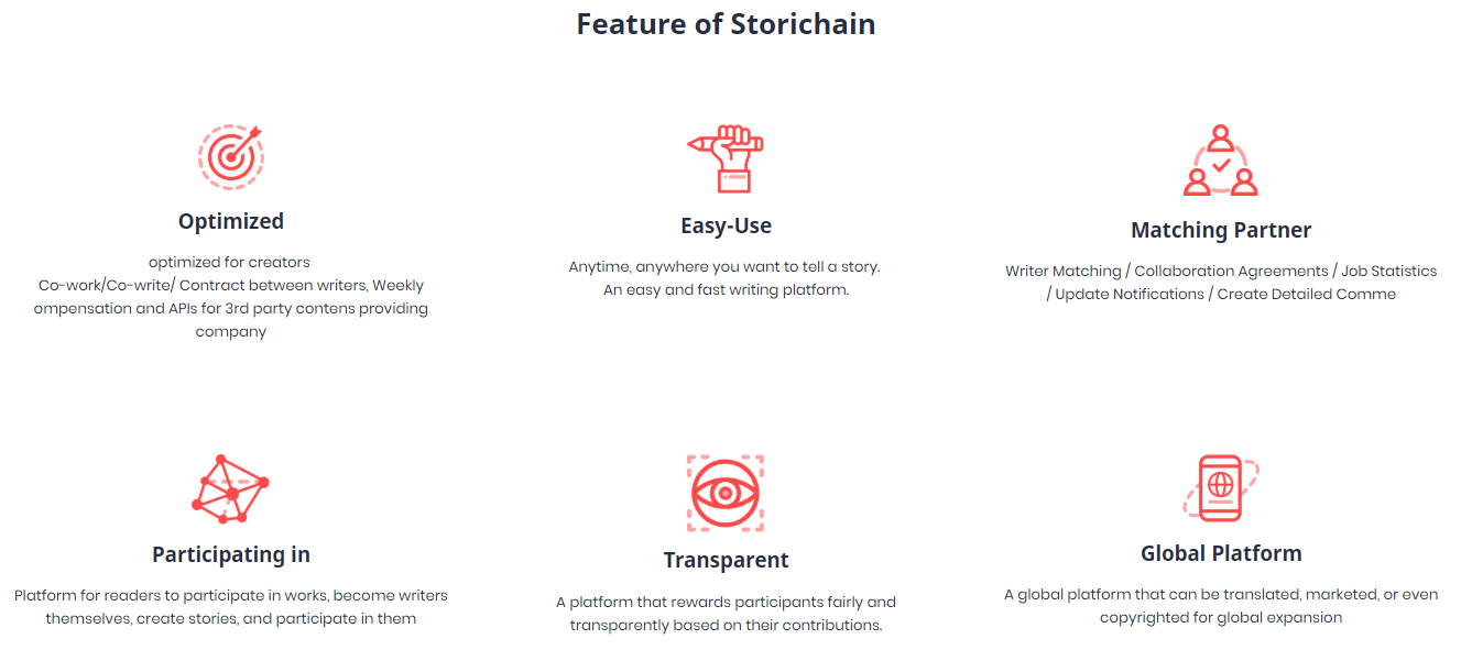 Storichain to protokół DApp i gawędziarzy, który tworzy historie, dystrybuuje i zarządza historiami IP. Jest to również protokół, który zawiera umowę na kontrakty historyczne. Użytkownicy mogą zmieniać swoją pozycję w ekosystemie łańcucha fabularnego jako pisarze, producenci i czytelnicy, a także uczestniczyć w tworzeniu opowiadań, zanim zostaną opublikowane jako oddzielne media, takie jak filmy, dramaty, kreskówki i gry. Ponadto, jeśli możesz otrzymać nagrodę za tygodniową składkę użytkownika przed sprzedażą praw autorskich, a historia, w której uczestniczyłeś, jest sprzedawana za drugą produkcję, taką jak publikacja, wideo, DApp) i Ethereum, jako główna sieć.