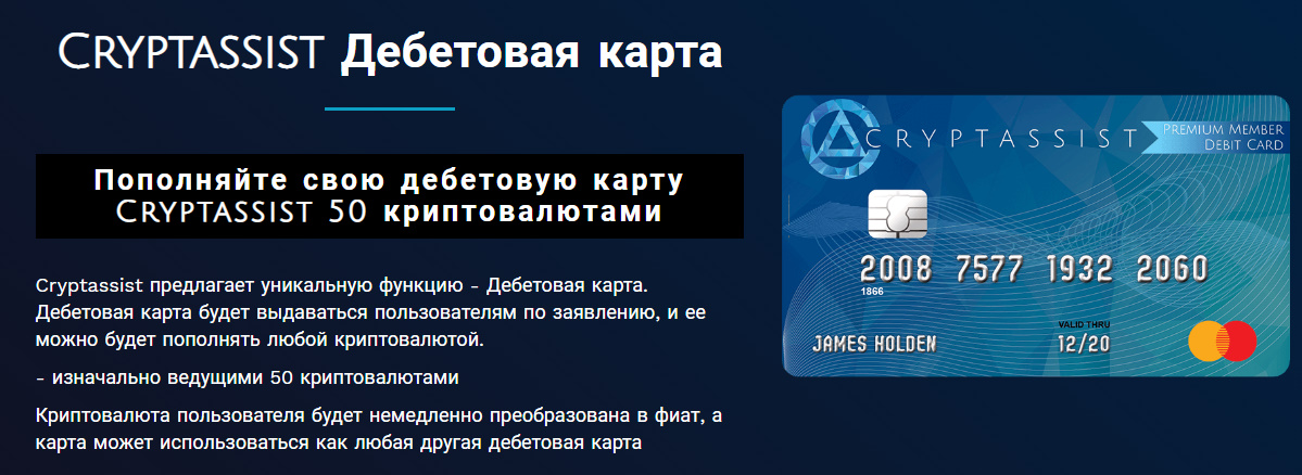 Cryptassist является универсальной платформой в мире криптовалюты для хранения информации, предназначена как для опытных специалистов, так и для новичков. Ключевым фактором платформы является простота в использовании. На одной платформе будут собраны все криптовалютные инструменты, что значительно поможет сэкономить время и избежать дополнительных усилий. Пользуясь мобильным и веб-приложением Cryptassist , пользователи смогут найти всю необходимую информацию о криптовалюте. Особенностями платформы Cryptassist являются: Дебетовая карта-выдается по заявлению и имеет возможность пополняться 50 ведущими криптовалютами, преобразованными в фиатные деньги; CryptoGo- криптоигра, награды в ней реальная криптовлюта; Cryptstarter- функция краудфандинга на платформе позволит собирать средства на реализацию проектов; Биржа- на собственной лицензированной бирже Cryptassist предоставит пользователям СТА преимущества в трейдинге и сниженную комиссию; Multi-Coin Block Explorer- функция, устраняющая необходимость использования нескольких blockchain explorers, чтобы находить историю транзакций разных монет; ChatPay- мессенджер, который работает в децентрализованной сети и объединяет социальные сообщения с онлайн-платежной системой; Cryptassist Philanthropy Innovation- бесплатное приложение для спонсоров, позволяющее делать пожертвования некоммерческим организациям, как в фиатных деньгих, так и в любой из 50 ведущих криптовалют; Уведомления о Возможноти Арбитража- пользователи имеют возможность устанавливать единицы объема торговли, а также получать уведомления когда интересующие их монеты отображают установленные цены на конкретных биржах и предоставляют возможности арбитража; ICO Ассистент- функция для разработчиков проектов, помогающая планировать и запускать ICO; Что купить за криптовалюту?- база данных и карта расположения продуктов и организаций, принимающих расчет в криптовалютах; Интернет-магазин- здесь клиенты смогут расплачиваться за продукты и услуги 50 ведущими криптовалютами; Cryptassist фрилансер- связь между компаниями или частными лицами с фрилансерами для совместной работы в проектах.