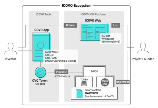 ICOVO - это платформа, основой которой является DAICOVO- смарт-контракт, который создан на основе концепции DAICO. Сайт проекта: https://icovo.co/. Эта платформа единственная в мире, которая позволит проводить здоровые ICO, используя децентрализованное регулирование. В качестве собственной валюты, позволяющей покупать инвестиции ICO, будет выпущен токен OVO. Это будет единственный в мире токен, специализирующийся только на закупках фонда ICO, что увеличивает надежность создания ICO на платформе ICOVO. Также на платформе будут предоставляться льготы для привлечения инвесторов на проведение ICO с использованием OVO. ICOVO с помощью предоставления таких услуг, как DAICOVO, OVO, ICOVO App и ICOVO Web стремится создать систему для надежных стартапов, связанных с блокчейнами.
