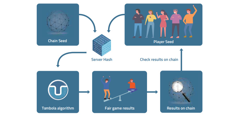 The main game structure of Tombola platform uses Chain Seed, Player Seed, and the nonce to receive game results. Tombola game results are encrypted through Chain Seed, Player Seed and nonce too, and then it is extracted using Tombola decoding and every results recorded in the blockchain, and everybody can watch it.