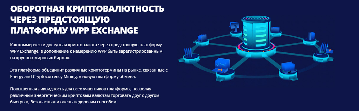 По мере постоянного роста рынка криптовалют, компания WPP ENERGY внедряет инновации в технологии блокчейн. Созданная платформа WPP EXCHANGE сможет контролировать, как новые, так и уже существующие криптовалюты, чтобы выбранные ею криптовалюты соответствовали росту рынка. Компания ведет переговоры с поставщиками энергии по всему миру о предоставлении скидок для своих пользователей. Добыча криптовалюты привела к глобальному энергетическому кризису, что создало огромный рынок возможностей для WPP. Количество энергии, потребляемой Bitcoin и Ethereum, начиная практически с нуля в 2010 году, возросло до 19,2 ТВт-ч в 2017году. Компания WPP ENERGY для решения проблемы майнинга криптовалют установит, как источник питания ННО мобильные электростанции в глобальном режиме. Криптовалютные майнеры смогут как купить, так и арендовать такую электростанцию. Для улучшения энергетической ситуации в мире компания WPP ENERGY имеет решение, путем преобразования примерно 20 000 загрязняющих окружающую среду электростанций в незагрязняющие на основе 100 % чистых энергетических установок с ННО. Эти преобразования также снизят на 65 % эксплуатационные расходы электростанций и значительно увеличат их мощность. Ожидается огромный спрос на этот проект, так как с его помощью весь мир ждет резкое сокращение угрозы глобального загрязнения и потепления.