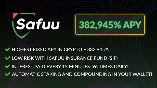 ☆ Crypto’s Highest Paying Auto-Staking and Auto-Compounding Protocol with the greatest fixed APY in the industry of 382,945%. Interest rewards are compounded every 15 minutes for every BSC wallet holding any $SAFUU tokens.
