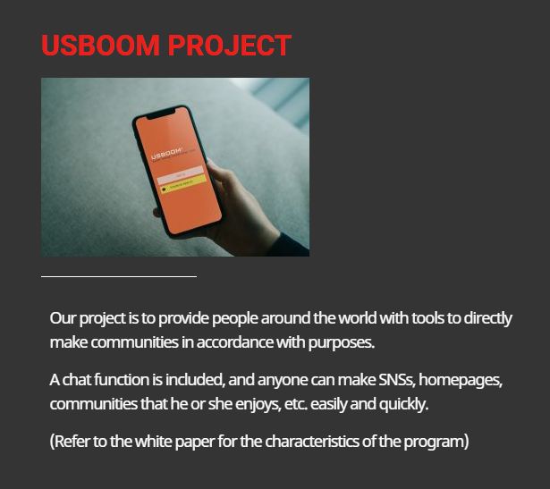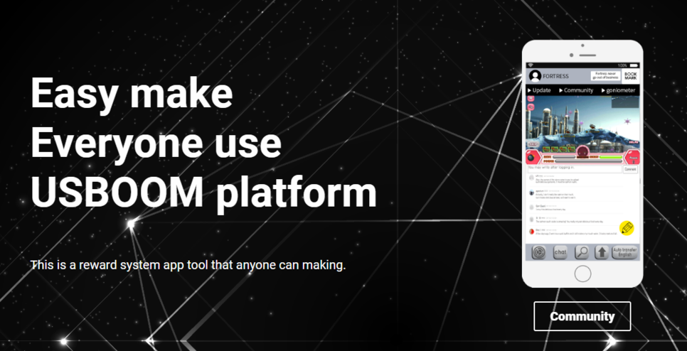 어스붐은 신뢰할 수 있고 안정된 플랫폼에서 사용자가 자신의 커뮤니티를 만들 수 있도록 분산된 온라인 커뮤니티 호스팅 플랫폼을 만들고 있습니다. 어스붐 플랫폼은 초보 인터넷 사용자가 온라인 커뮤니티를 수 분 내에 쉽게 구축 할 수 있도록 설계되었습니다. 사용자는 다양한 유형의 커뮤니티를 만들고, 커뮤니티를 성장시키고, 게시물에 USB 코인(어스붐에서 사용되는 토큰 심볼), 호환되는 디지털 통화 적립이 가능합니다. 또한, 블록 체인 네트워크의 특징 인 보안에 우선 순위를 두어 세부적으로 계획되었습니다.