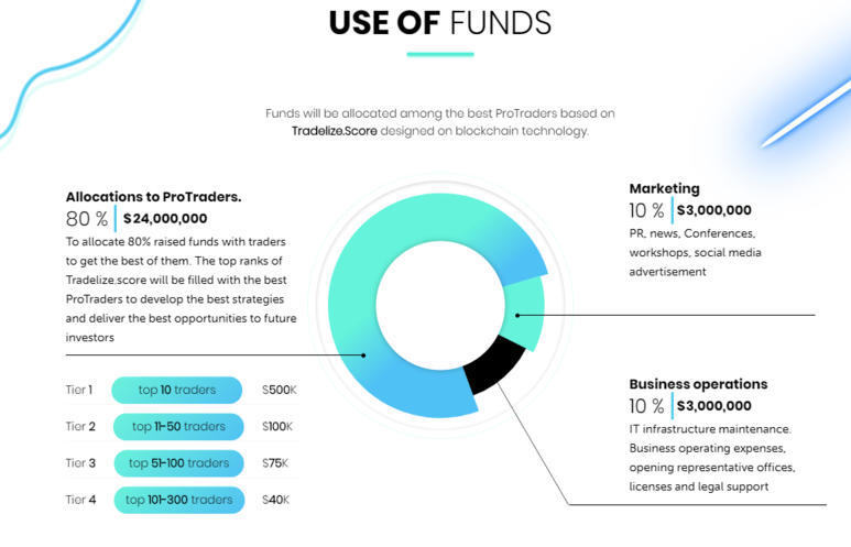 모든 거래는 블록 체인에 기록되어 안전하고, 보안 및 조작 방지를 보장해 줍니다. 시스템은이 데이터를 사용하여 여러 가지 요인에 따라 거래자의 범위를 정하고 프로필 및 점수를 수집합니다. 기금은 관리를 위해 그들에게 배포 될 것입니다(사실, Tradelize.web 도구를 통해 미래의 사용자가 사용할 전문 지식을 교환 할 것입니다.)