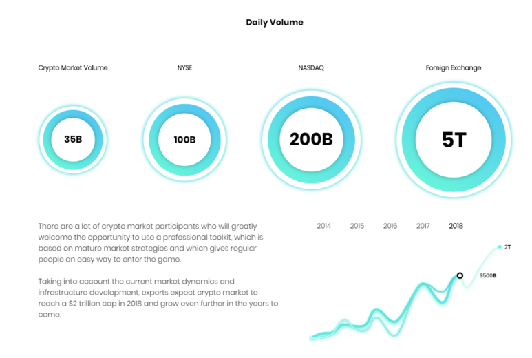 볼륨이 갈수록 커지고 있네요. 성숙한 시장 전략을 기반으로하고 일반인에게 게임에 쉽게 접근 할 수있는 전문 툴킷을 사용할 수있는 기회를 크게 환영 할 많은 시장 참여자가 있습니다. 전문가들은 현재의 시장 역학 및 인프라 개발을 고려할 때 암호화폐 시장이 2018년에 2조 달러에이를 것으로 예상하고 향후 수 년 내에 성장할 것으로 예상합니다. (저도 제발 그랬으면!)