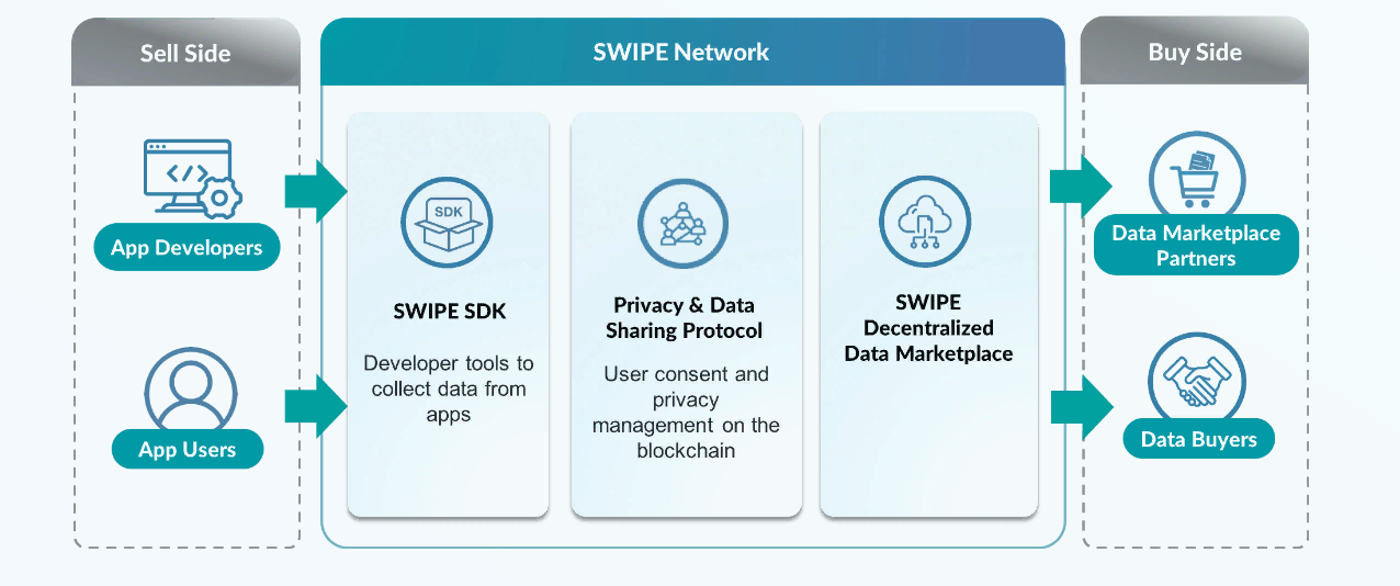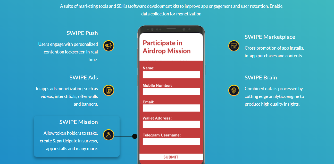 SWIPE is a platform that provides mobile application developers with a variety of marketing solutions and software to save data users and ensure fair payment for the provision of this data. The platform consists of 3 main solutions: SWIPE SDK, Privacy & Data Sharing Protocol and SWIPE Decentralized Data Marketplace.