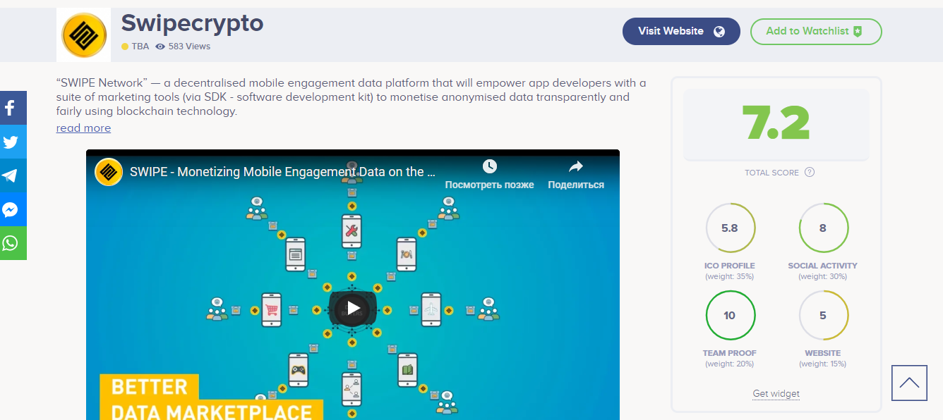So, according to the site INVESTFUTURE overall rating in the green zone and is 66.45 out of 100 possible. This site takes into account the rating on several services and displays the average. The Agency TRACKICO evaluates SWIPE at 4.1 out of a possible 5. This site reflects the amount of information available about the project. Based on this assessment, it can be concluded that the team does not hide anything and provides all possible information about their project to everyone, it is commendable. Agency ICOMARKS gives a general estimation of the project SWIPE 7.2. This estimate consists of several. For example, project team they rate a 10 out of 10! It is the highest an indicator that is only possible. The activity of the team and the community - 8.0 is also very high. For information on the site they received only 5 out of 10. This estimate lowered the average rating of the project. I also want to highlight the assessment from ICORATING - they estimate hype around the project as high. In the sphere in which the SWIPE is developing - high hype is very good.