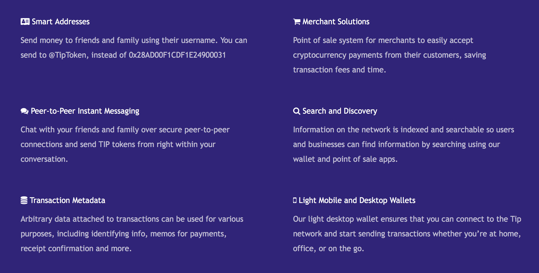 Tip is a Third Generation Blockchain that connects users over peer to peer networks, and merchants with payment solutions, making it easier than ever to transact using cryptocurrency. Information on the network is indexed and searchable so users and businesses can find information by searching using our wallet and point of sale apps. Arbitrary data attached to transactions and accounts can be used for various purposes, including identifying info, memos for payments, receipt confirmation and more.