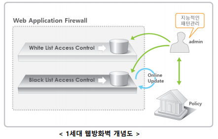 1세대 : 블랙리스트와 화이트리스트를 두어 블랙리스트 접근은 막고 화이트리스트의 접근은 통과를 시킵니다. 블랙리스트는 온라인으로 업데이트하여 공통적으로 사용하나 화이트리스트는 고객에 따라 달라서 해당 고객의 관리자가 직접 생성 관리하는 부담이 있습니다. (최종적으로 블랙리스트, 화이트리스트 모두 관리자가 해야 합니다. ).