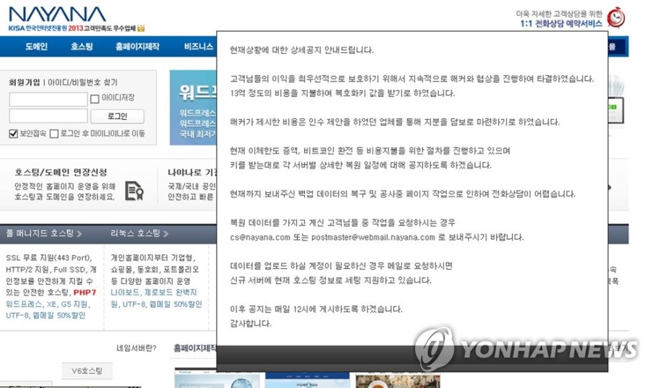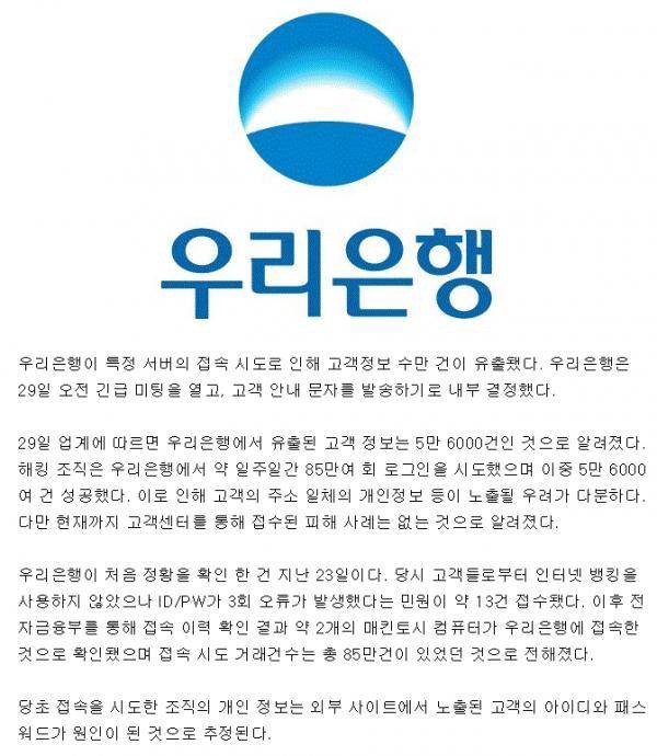 랜섬웨어에 당한 케이스입니다. 해킹에 성공해서 각 서버의 데이타를 암호화한 후 해제키를 줄테니 50억원(비트코인)을 달라고 요구했고 어쩔 수 없이 16억원을 건네고 복구했습니다. 위 케이스 모두 보안업계에서는 유명한 사례입니다. 그리고 최근 케이스는 우리은행입니다. Brutal Force Attack으로 65,000건의 개인정보가 유출되었죠.