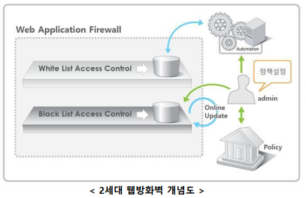 2세대 : 대상 웹 애플리케이션을 모니터링, 분석하여 화이트리스트 생성을 자동으로 처리해줍니다. 하지만 빠르게 변화하는 웹 환경에 적합하지 않았습니다. 이전처럼, 생성된 화이트리스트 또한 적용을 위한 최종 검토 및 관리가 필요하여 관리자의 부담은 여전히 존재했으며, 웹 보안 환경에 존재하는 다양한 웹 공격 유형을 파악하지 못했기 때문에, 많은 성능 저하 및 오탐 이슈를 불러일으켰습니다.