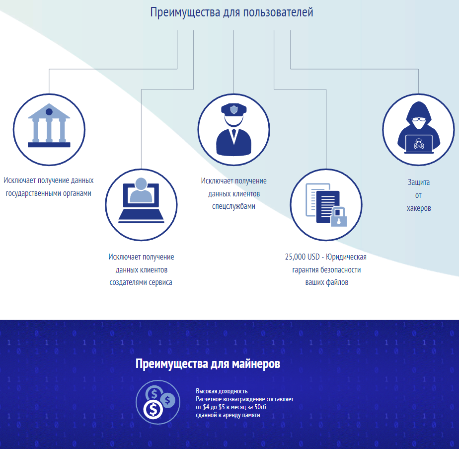 - Платформа распределяет данные случайным образом между майнерами и использует запатентованный алгоритм шифрования SIZE, который обеспечивает их надежную защиту;