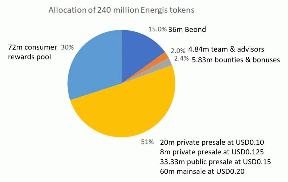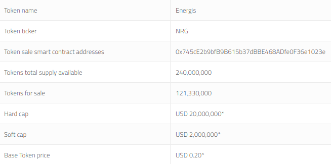 Название монеты – NRG (Energis), ее обеспечивает протокол ERC20 (Ethereum). Общее количчество токенов – 240 миллионов. Hardcap составляет 20 миллионов USD, softcap – 2 миллиона USD во время публичной продажи токенов.