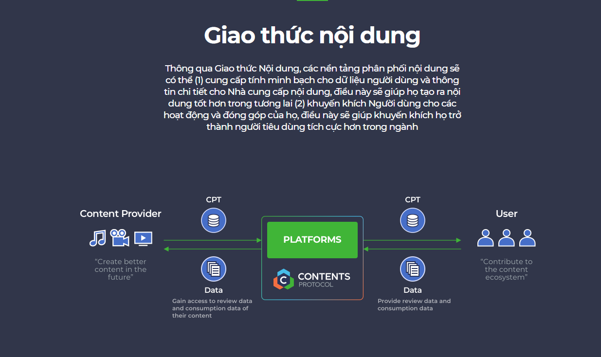 Đây là một giao thức trao đổi nội dung blockchain phi tập trung, nơi nhà cung cấp nội dung và người dùng của nó có thể gặp gỡ và tương tác. Nhiệm vụ giao thức nội dung để giới thiệu một ngành công nghiệp nội dung ưu việt trong lĩnh vực tiền điện tử thông qua blockchain. Với một hệ sinh thái nơi các nhà cung cấp nội dung, dịch vụ nền tảng và người tiêu dùng tương tác với nhau để phát triển hệ sinh thái của ngành. Giao thức nội dung hỗ trợ trong việc giúp người tạo nội dung không có đủ tài nguyên để cải thiện kỹ năng của họ. Nhóm dự định cung cấp một dịch vụ tiên tiến để giải quyết các vấn đề gặp phải trong lĩnh vực Công nghệ Blockchain.
