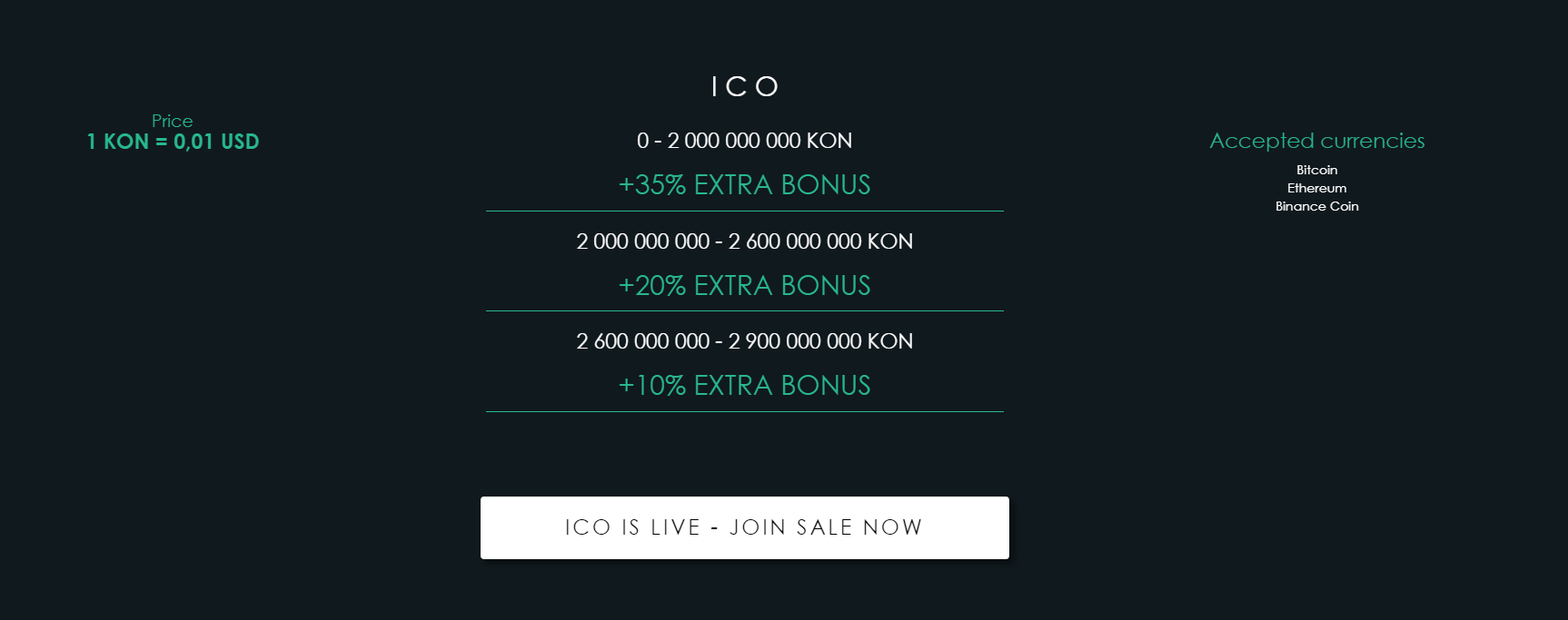 Within the framework of the Platform, developers are provided with systems of loyalty and rewards for their users. To encourage their users they will be using KON tokens. All rewards will be credited to users automatically on their purse. Which I find very convenient. Total developers for ICO will allocate 3 750 000 000 tokens KON. The cost of one KON is equal to $0.01. This ICO will be scheduled and will commence on 1 July 2018, and later will run for 90 days. But as the developers say, they can interrupt the ICO before, after they have gathered the Hard Cap in the amount of 29 000 000 USD.