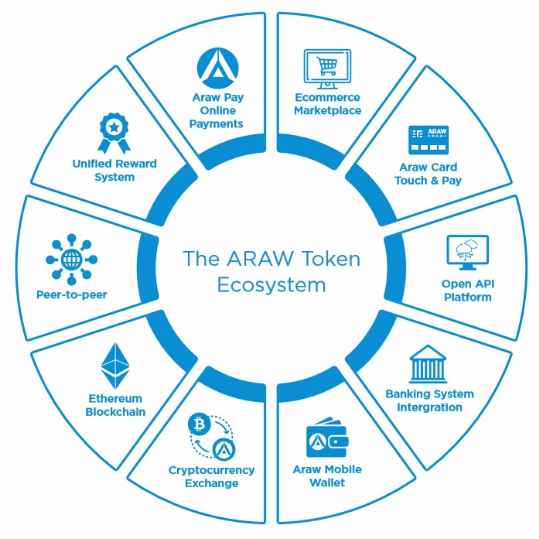 The ARAW Token ICO Private & Public Sale; E-commerce Marketplace; Unified Reward System; Peer-to-Peer Transfer.