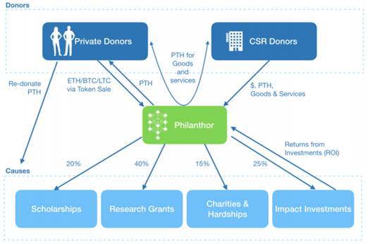 Вторая проблема заключается в реализации проекта. Некоторые хорошие идеи не воплощаются в жизнь из-за отсутствия финансирования или добровольцев. Затем у Филантора есть решение - его способность к обратному копированию. Пожертвования поступают в виде жетонов под названием PTH. Токенизация фундаментальной индустрии облегчает добросовестную домохозяйку из Юго-Восточной Азии пожертвовать Женщинам ООН, которая является глобальной организацией. В традиционной настройке отправка пожертвований за границу может по-прежнему нести сборы, которые не являются ценными, добавляя ни к донору, ни к получателю.
