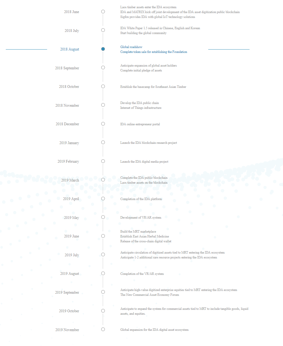 It is planned for the IDA Token to eventually be listed on major exchanges, but all secondary MRT tokens in the ecosystem would only be paired with the primary IDA Token (which functions as the common platform currency and the bridge with the real world). It is projected that this will lead to increased demand for the IDA Token.