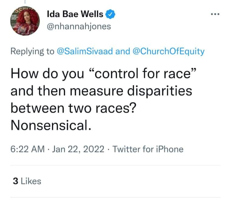 The bigger thing is that her entire worldview is predicated on the ideas of racial equity. If it's nonsensical to control for race and measure racial disparities, it's impossible to measure for racial equity. If it's impossible to measure for equity, her entire worldview is nonsensical. It's like packing the entire country into a car and picking a random road to drive us down with no concept of the destination in the head of the driver. Either that or she's actively trying to further abstract her worldview so she can't be adequately proven wrong -- you can't say that you hit a bullseye when the red dot is the size of a Buick.