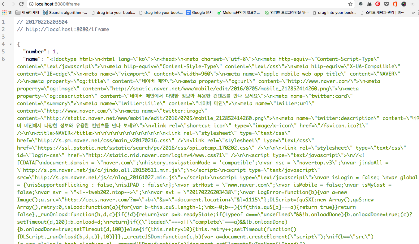 서버가 html 문서를 스트링 형태로 지니고 있고, 이 중개 서버에 브라우저가 접속해서 정보를 빼오는 방식이었다. 생각처럼만 된다면 문제 될 것이 없었다. 크롬 브라우저를 통해 컨트롤러에 요청을 보내보았다
