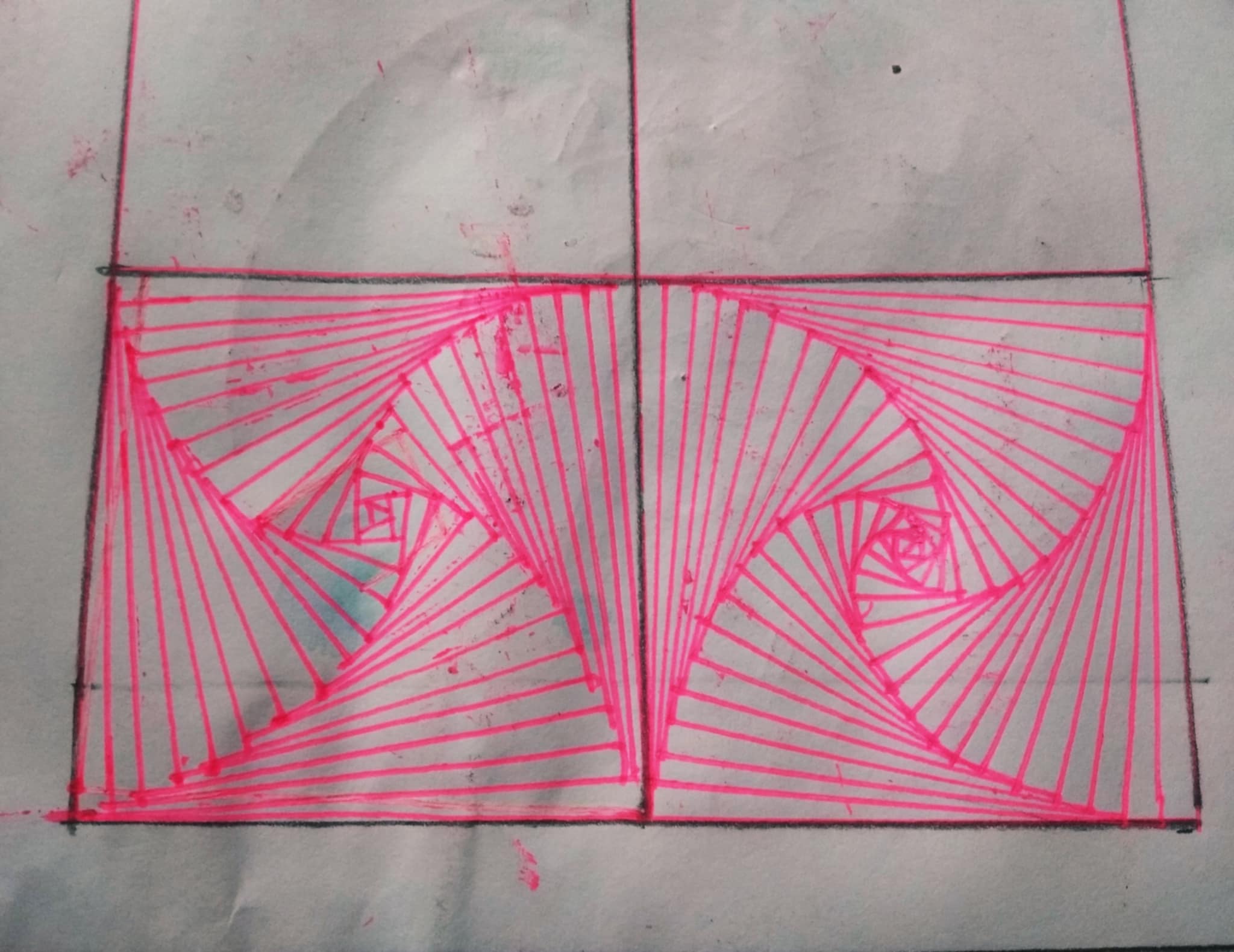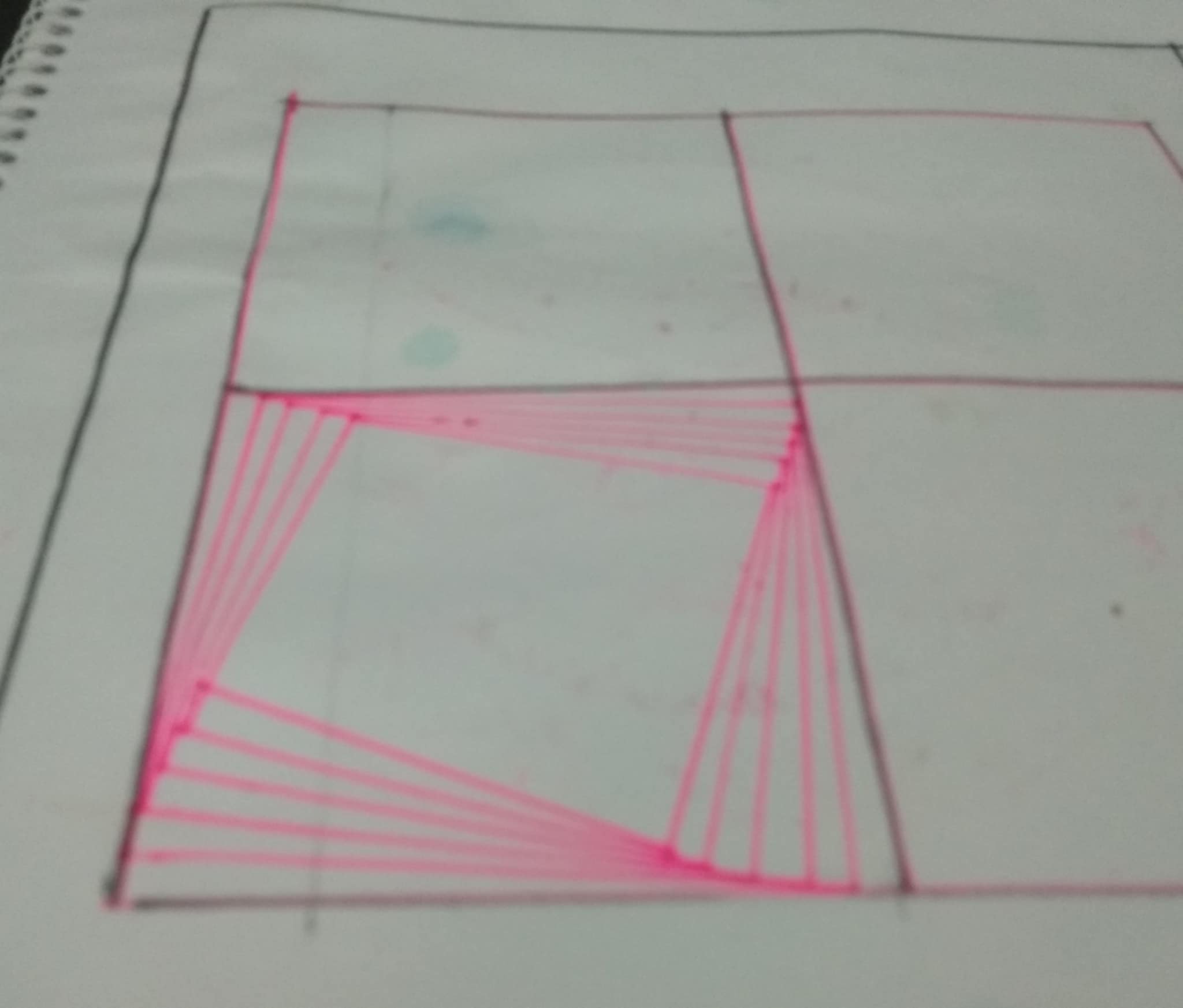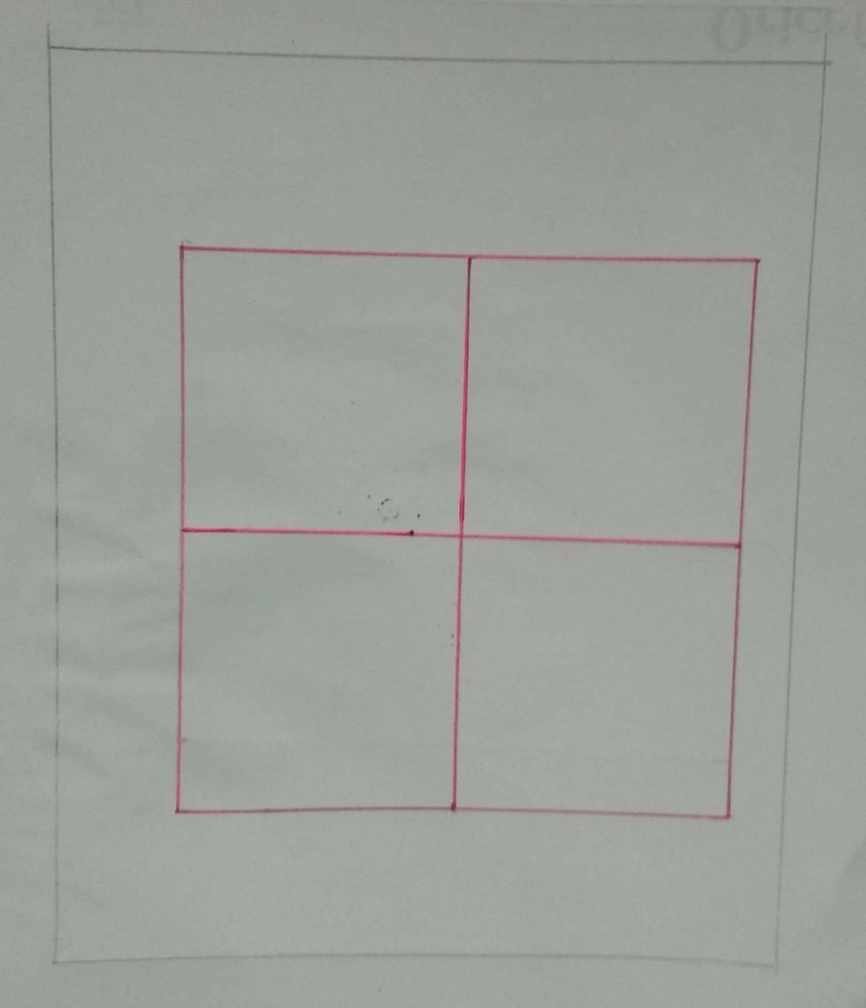 একটি বর্গক্ষেত্র এঁকে নিয়েছি। এবার বর্গক্ষেত্রটিকে চারটি অংশে ভাগ করে নিয়েছি।ফলে চারটি বর্গক্ষেত্র তৈরি হয়েছে। এবং পেন্সিলের দাগের উপর গোলাপী জেল পেন দিয়ে দাগ দিয়ে নিয়েছি। কারন সম্পূর্ণ ইলিউশন আর্টটি আমি গোলাপী জেল পেন দিয়ে করবো।