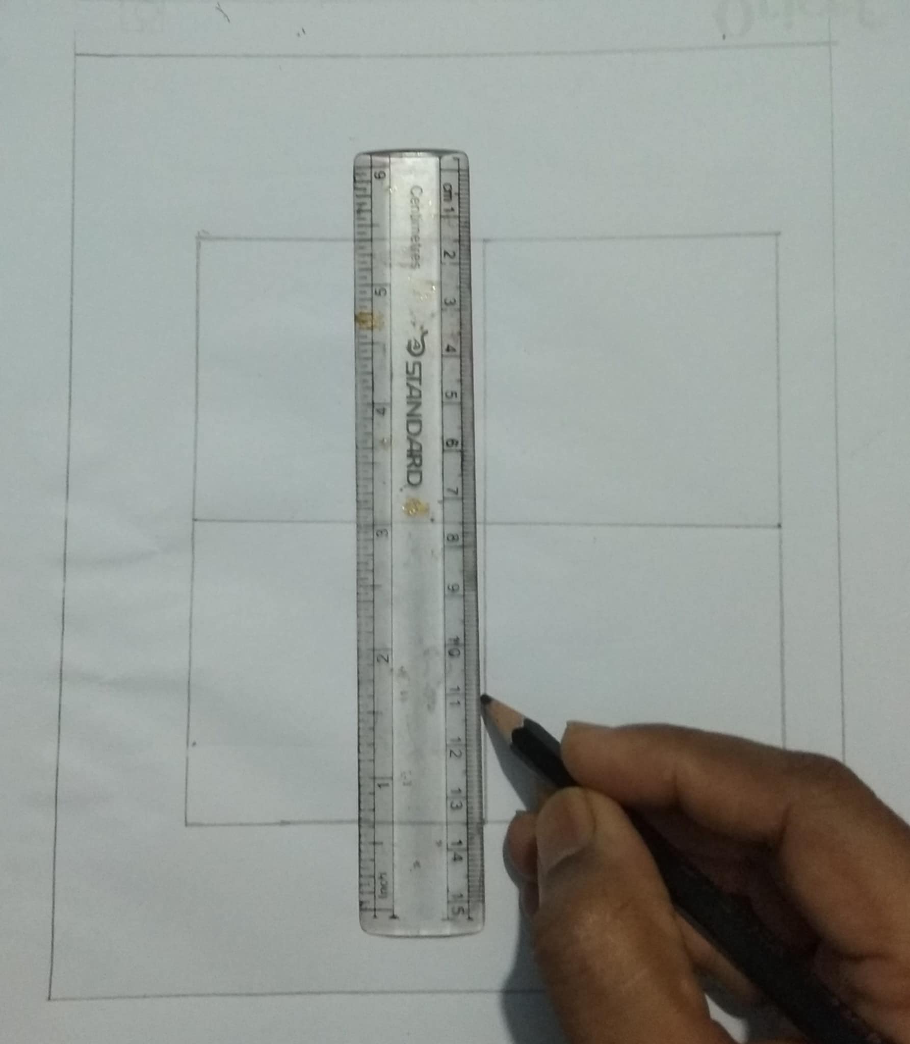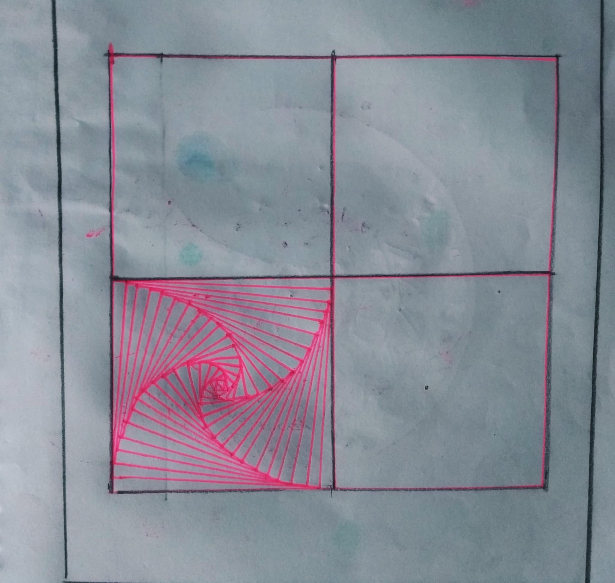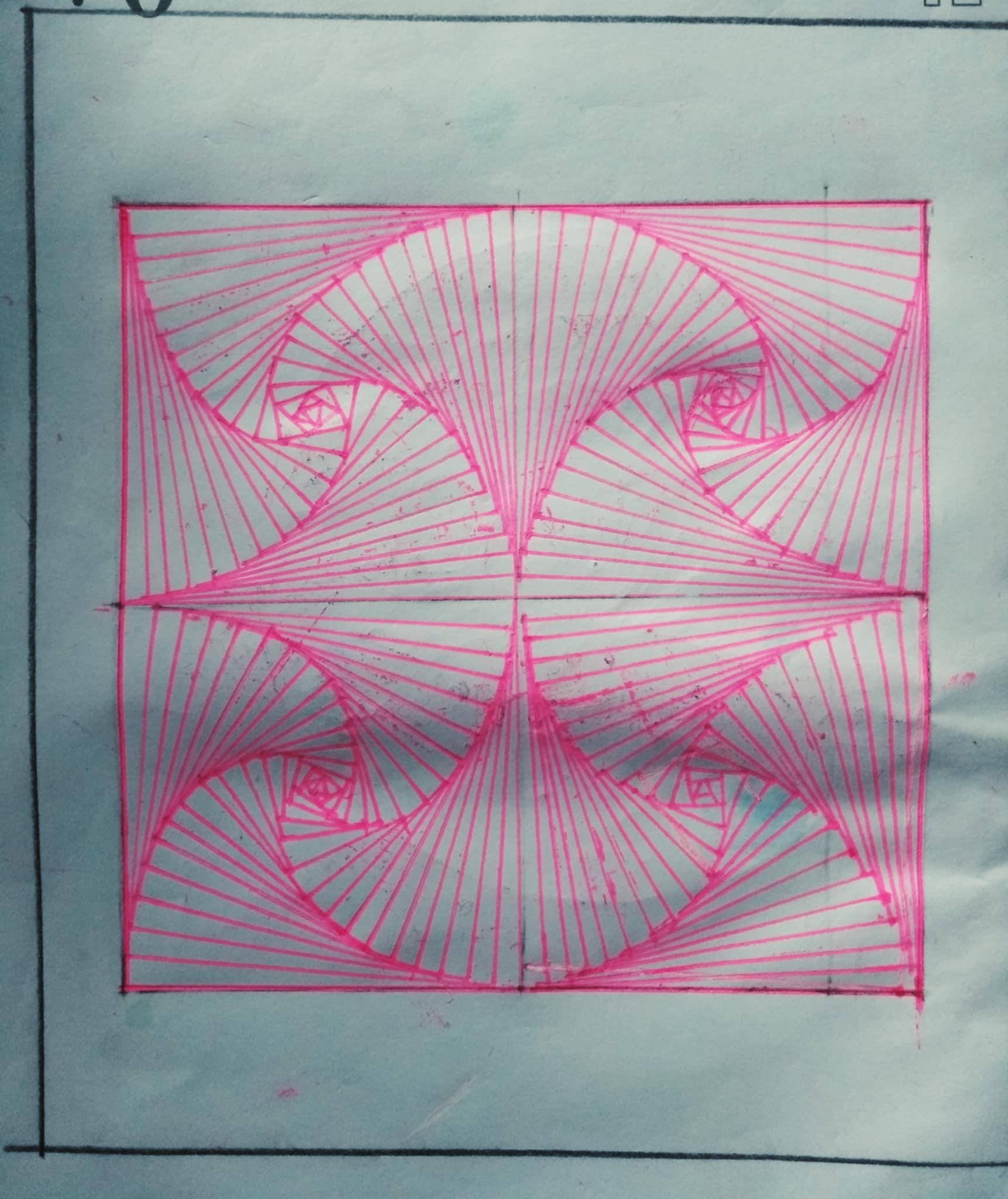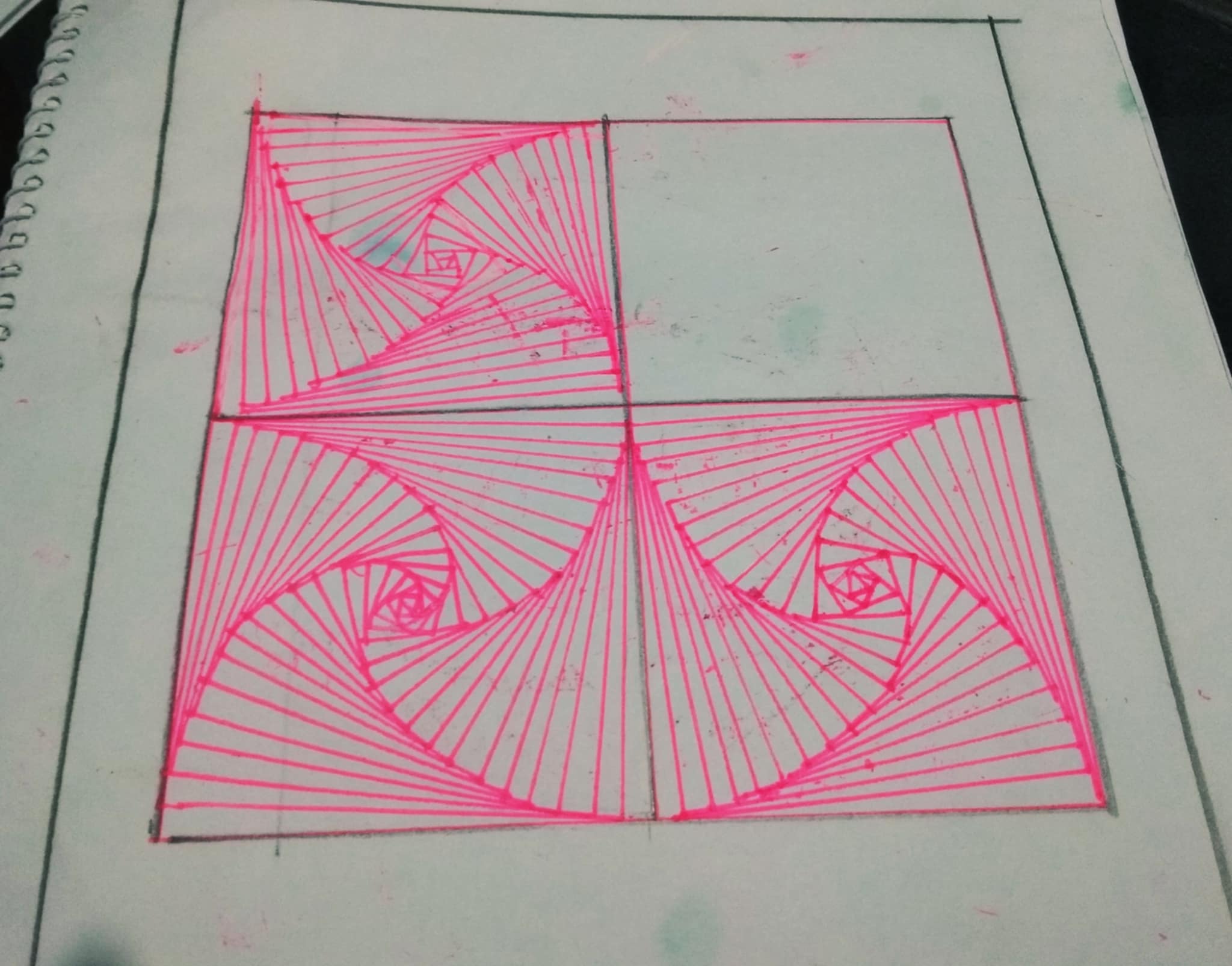 একটি বর্গক্ষেত্র এঁকে নিয়েছি। এবার বর্গক্ষেত্রটিকে চারটি অংশে ভাগ করে নিয়েছি।ফলে চারটি বর্গক্ষেত্র তৈরি হয়েছে। এবং পেন্সিলের দাগের উপর গোলাপী জেল পেন দিয়ে দাগ দিয়ে নিয়েছি। কারন সম্পূর্ণ ইলিউশন আর্টটি আমি গোলাপী জেল পেন দিয়ে করবো।